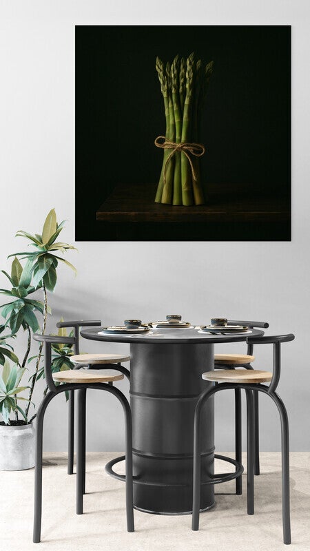 Een minimalistisch en krachtig beeld van een bundel groene asperges, zorgvuldig samengebonden met touw. De donkere achtergrond en warme houttinten geven dit werk een klassieke uitstraling met een moderne twist. Perfect voor liefhebbers van pure ingrediënten en serene, natuurlijke keukensferen.