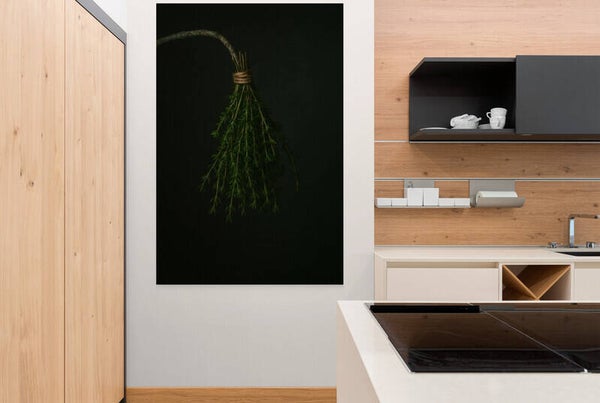 Een bundeltje verse groene kruiden, hangend aan een touwtje tegen een donkere achtergrond. De eenvoud en het zachte licht maken van dit werk een verstild eerbetoon aan de natuur. Ideaal voor keukens, eetruimtes of rustgevende interieurs waar natuurlijke details mogen spreken.
