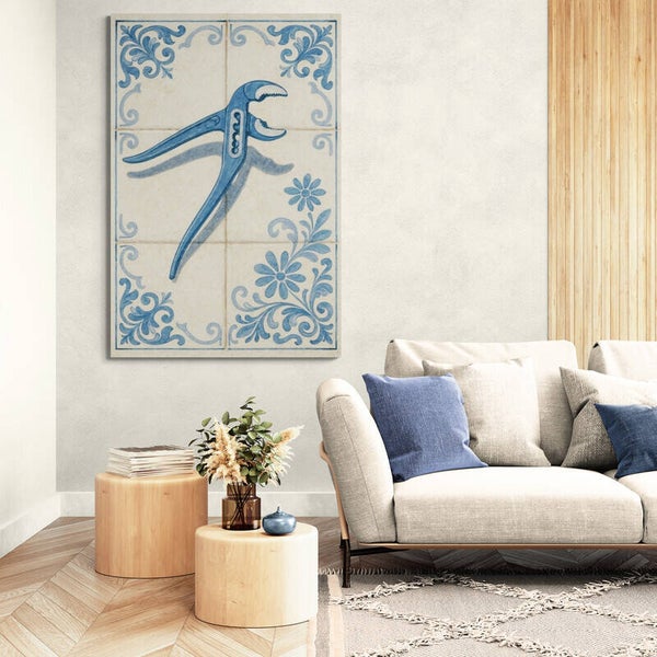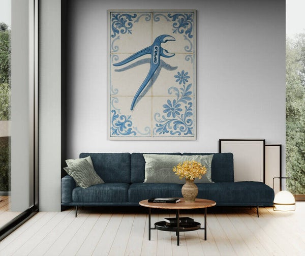 Een verrassende combinatie van traditie en moderniteit: dit kunstwerk toont een realistische waterpomptang afgebeeld op een klassiek Delfts blauw tegelmotief. De verweerde structuur en bloemrijke details zorgen voor een authentieke uitstraling, terwijl het gereedschap het geheel een speels en eigentijds karakter geeft. Perfect voor liefhebbers van unieke kunst die een knipoog naar het dagelijks leven waarderen.