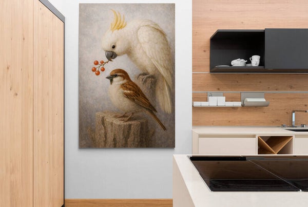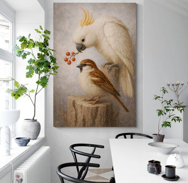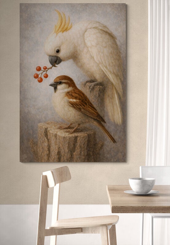 Een uniek schilderij waarin een witte kaketoe met rode bessen en een mus samen in beeld worden gebracht. Het contrast tussen de statige kaketoe en de alledaagse mus geeft dit werk een warme, landelijke charme. De zachte natuurtinten, verfijnde details en rustige achtergrond zorgen voor een huiselijke en tijdloze uitstraling. Dit schilderij past perfect binnen een landelijke inrichting of een interieur waar natuurlijke rust centraal staat.