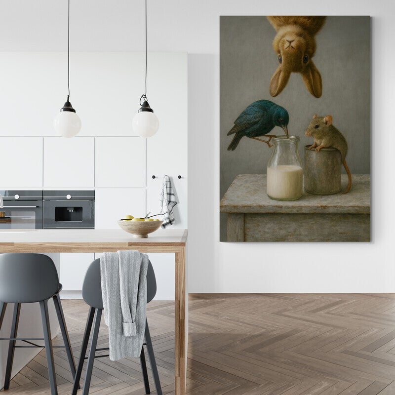 Een fantasierijk schilderij waarin een konijn, vogel en muis zich verzamelen rond een fles melk. Het tafereel straalt speelsheid en humor uit, alsof de dieren samen een geheimpje delen. Perfect voor een interieur dat vraagt om een vrolijke en originele blikvanger.