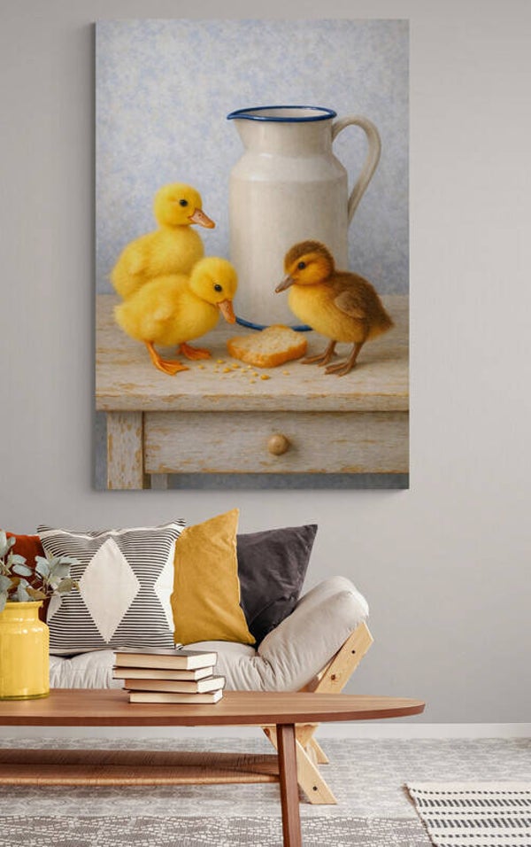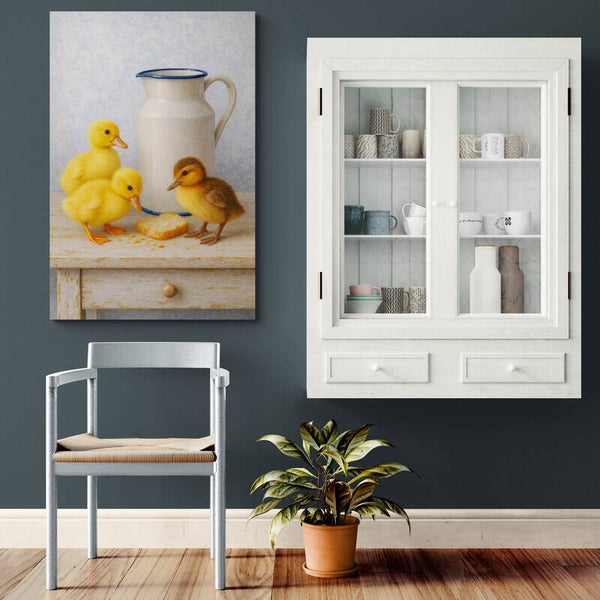 Een vertederend schilderij waarin drie eendenkuikens samen een stukje brood delen aan tafel. De zachte details, warme tinten en nostalgische sfeer maken dit kunstwerk een charmante aanvulling voor elk interieur.