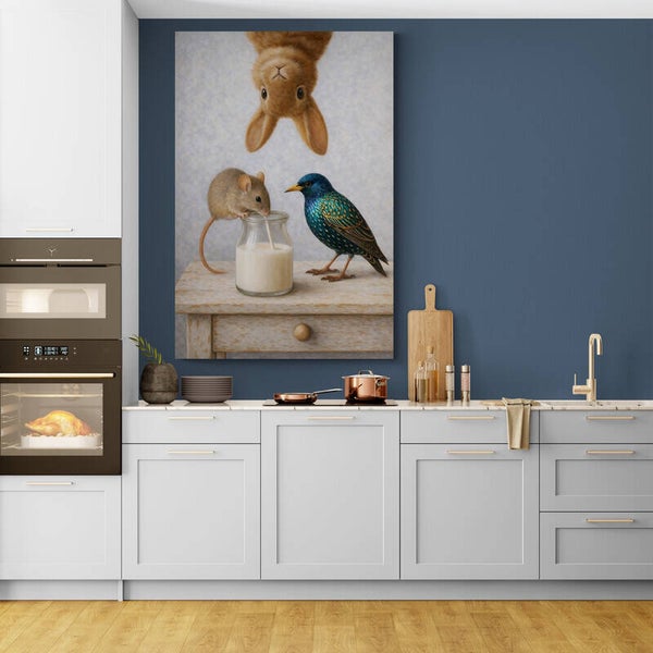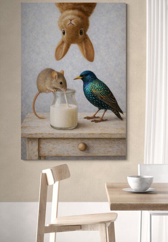 Een nostalgisch en speels dierenschilderij waarin een muis uit een melkfles drinkt, een vogel nieuwsgierig toekijkt en een konijn ondersteboven meeglundert. De zachte realistische details en warme kleuren geven dit tafereel een duidelijke landelijke uitstraling, met een knipoog naar nostalgie. Een kunstwerk dat vrolijkheid en huiselijke gezelligheid uitstraalt.