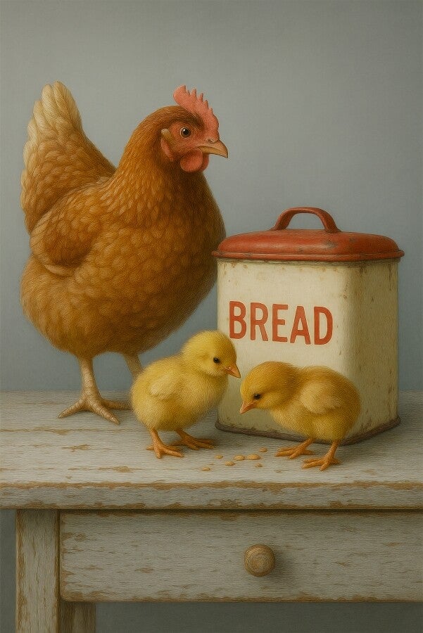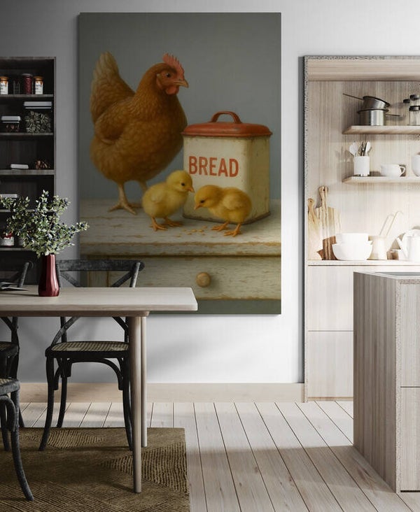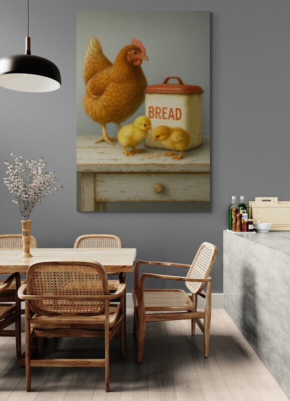 Een nostalgisch dieren schilderij waarin een kip met haar kuikens waakt bij een oude broodtrommel. Het tafereel straalt huiselijke warmte en eenvoud uit, alsof het uit een herinnering komt. De realistische details en zachte tinten maken dit werk een charmante toevoeging voor ieder interieur.