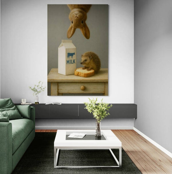 Een nostalgisch dieren schilderij waarin een nieuwsgierig konijn boven de tafel hangt terwijl een egel rustig op een snee brood zit naast een pak melk. Het tafereel straalt eenvoud, warmte en een vleugje humor uit, alsof het een stilleven uit een kinderherinnering is.