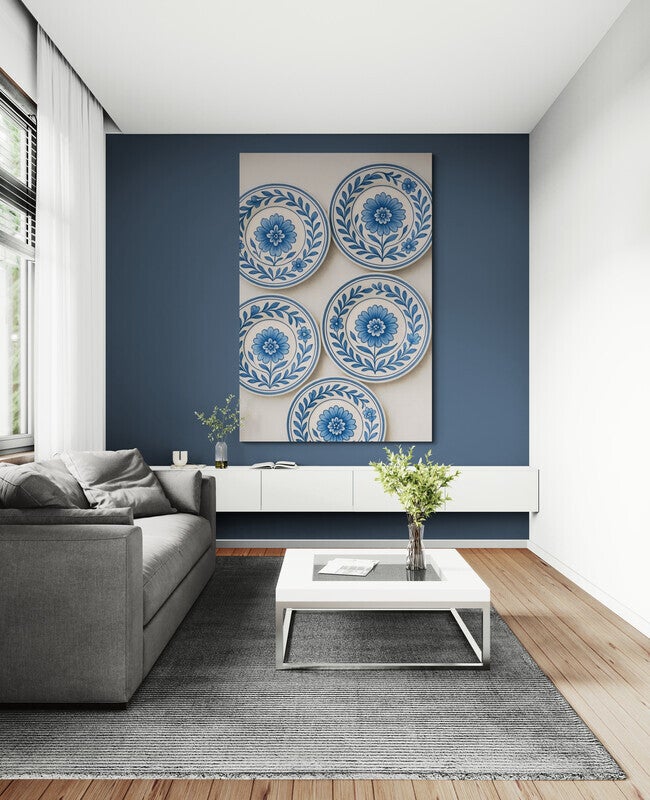 Een set Delfts blauwe borden met een verfijnd bloemmotief. De blauwe decoratie op het crèmekleurige porselein straalt elegantie en traditie uit. De zachte papierachtige structuur in het beeld geeft een authentieke, handgemaakte uitstraling. Perfect als wanddecoratie of als stijlvol servies.