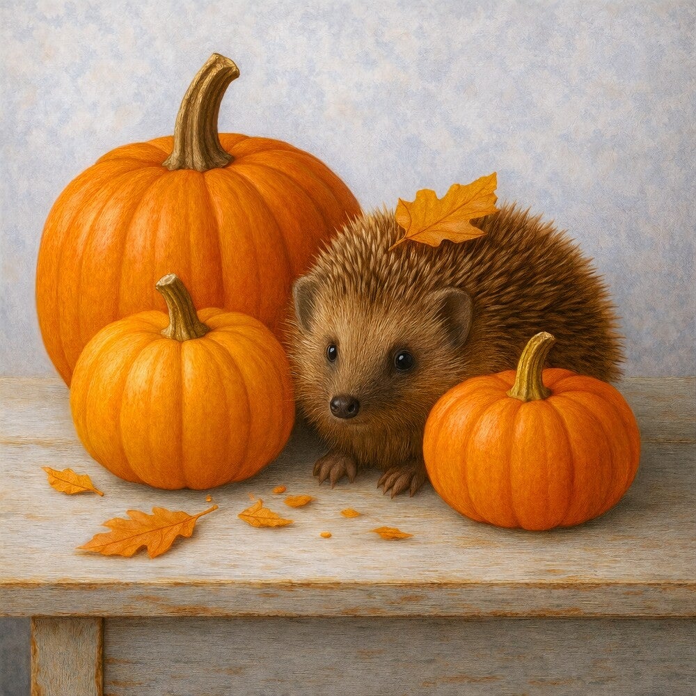 Een sfeervol schilderij met een nieuwsgierige egel tussen pompoenen en herfstbladeren. De warme tinten en natuurlijke details brengen een knusse en huiselijke sfeer in de keuken of eetkamer. Het schilderij combineert speelsheid met rust, ideaal om een vleugje herfst toe te voegen aan je interieur.