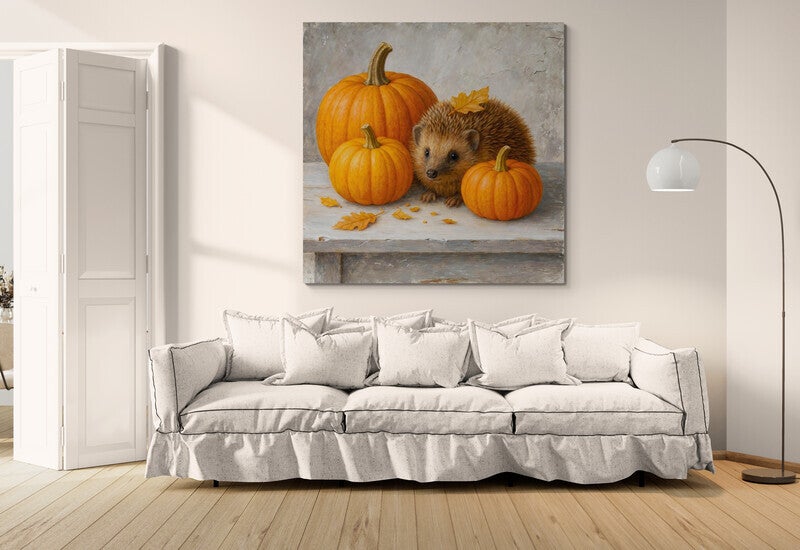 Een warm en sfeervol kunstwerk waarin een egel omringd wordt door pompoenen en herfstbladeren. De compositie straalt rust en gezelligheid uit en brengt direct een seizoensgevoel in huis. De achtergrond heeft een licht ruwe, stucachtige structuur met subtiele scheurtjes en kleurovergangen, wat zorgt voor een natuurlijke en doorleefde uitstraling. Dit schilderij is perfect voor een keuken, eetkamer of woonkamer met een warme en landelijke sfeer.