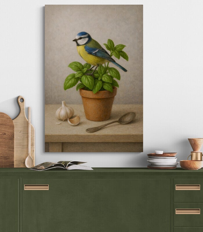 Een sfeervol schilderij in de stijl van een stilleven, waarin een koolmees is neergestreken op een pot basilicum. De zachte schilderachtige structuur, het terracotta potje en de details van knoflook en lepel geven dit kunstwerk een nostalgische, huiselijke sfeer. Een subtiel accent voor een keuken of eetkamer.