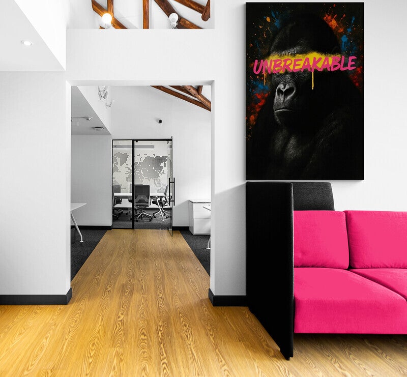 Een krachtig kunstwerk dat de onverzettelijkheid van de gorilla benadrukt. Met zijn donkere silhouet en intense aanwezigheid vormt hij de perfecte basis voor de neonroze graffiti-tekst UNBREAKABLE. De felgekleurde verfspatten in geel, rood en blauw versterken het street-art karakter en geven het schilderij energie en diepte. Een modern statement piece dat staat voor kracht, doorzettingsvermogen en lef.