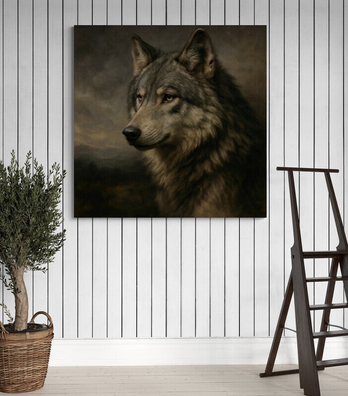 Nobele wolf is een sfeervol portret waarin de wilde ziel van de wolf centraal staat. De zachte aardse tinten en realistische penseelstreken geven het kunstwerk een tijdloze uitstraling. Dit schilderij ademt kracht, onafhankelijkheid en mysterie, en brengt een vleugje natuur en symboliek in elk interieur.