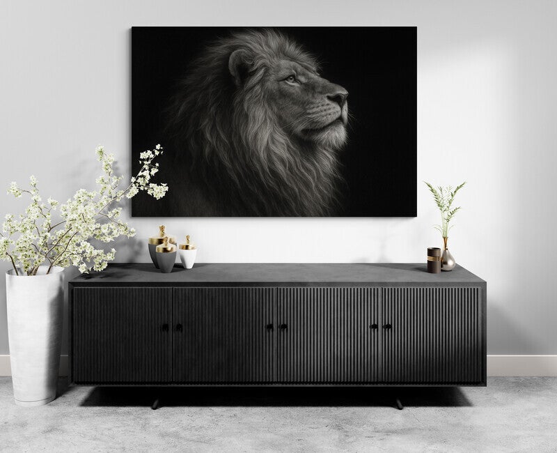 Een indrukwekkend en realistisch portret van de koning van de dieren: de leeuw. De fijnschilders-stijl benadrukt elk detail van de manen en de krachtige blik, waardoor dit schilderij kracht en elegantie uitstraalt. Perfect voor een modern, luxe of klassiek interieur.