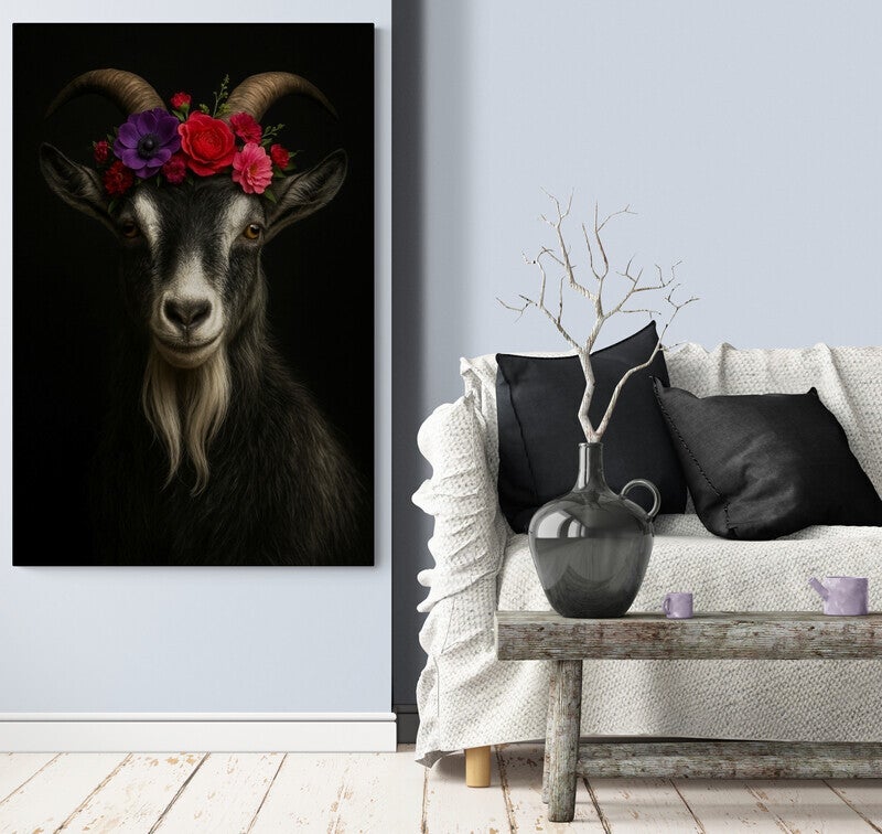 Een sierlijk en statig portret van een geit met een kleurrijke bloemenkroon, afgezet tegen een diepzwarte achtergrond. De combinatie van natuurlijke kracht en verfijnde bloementonen maakt dit kunstwerk bijzonder in balans. De expressieve blik en de realistische vachtstructuur geven het geheel karakter en charme. Een opvallend en stijlvol dierenportret dat perfect past in een modern of eclectisch interieur.