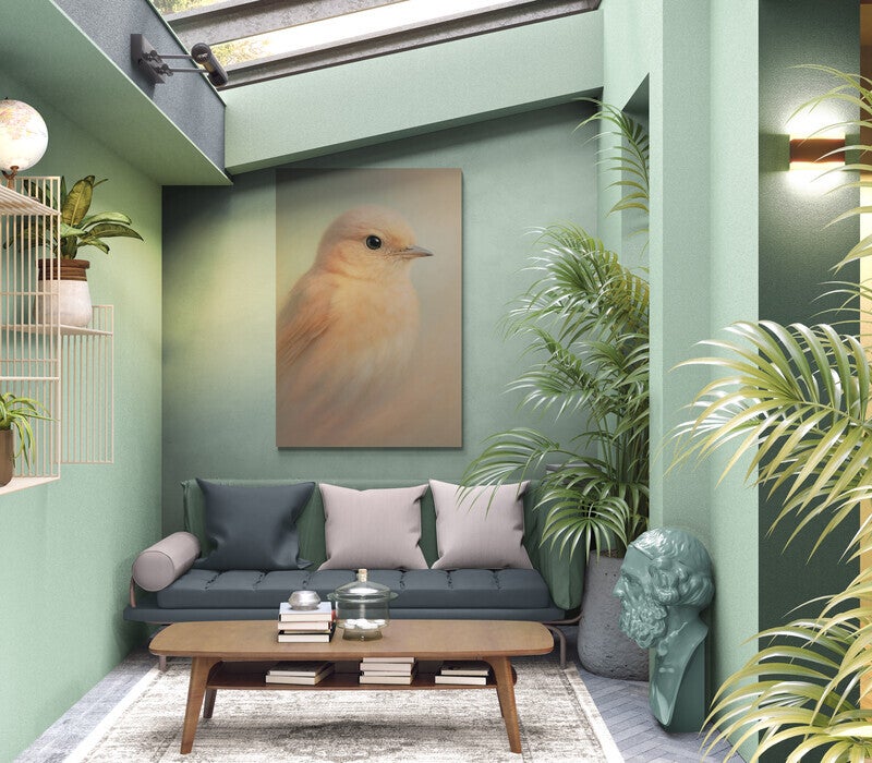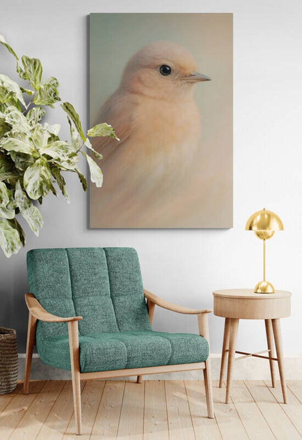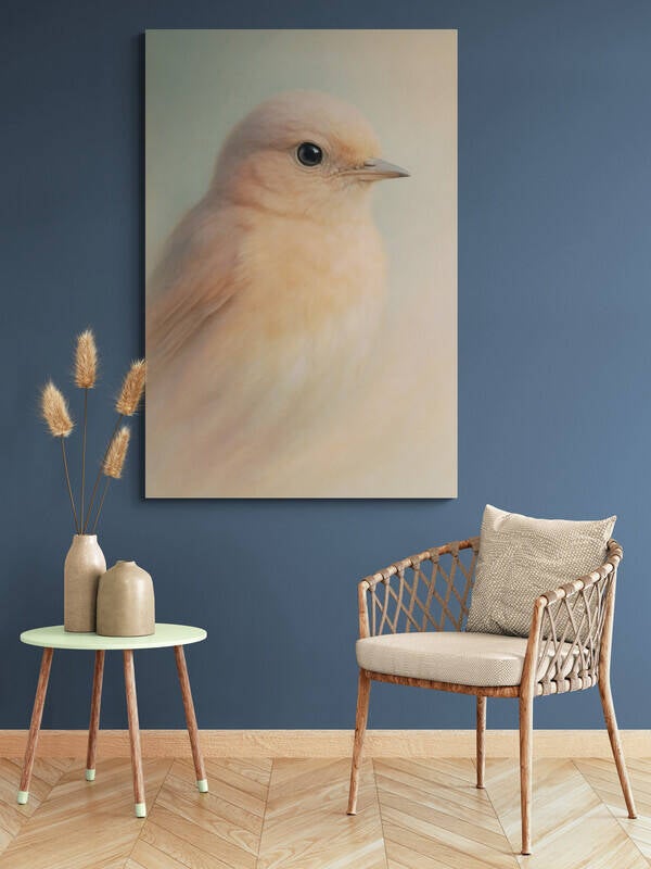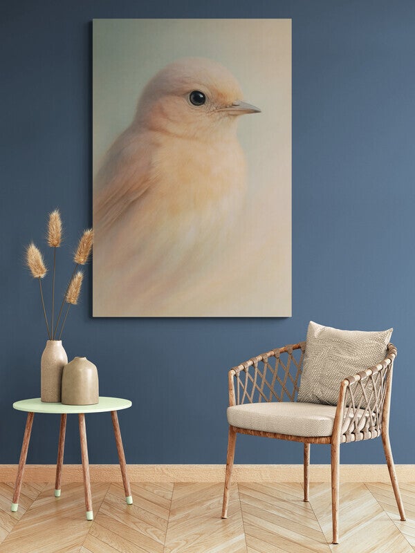 Een dromerige, haast tastbare afbeelding van een vogeltje in poederzachte tinten. De pastelkleurige achtergrond vloeit subtiel over in het zachte verenpak, waardoor het geheel aanvoelt als een stille aquarel. Deze afbeelding ademt rust en tederheid en is perfect voor interieurs met een lichte, serene stijl of als lieflijke blikvanger in een kinderkamer.