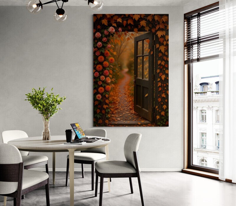 Dit schilderij vangt het moment waarop je letterlijk en figuurlijk een nieuwe wereld instapt. De donkerhouten deur staat open naar een met bladeren bedekt pad in zachte focus. Links groeien rozen, dahlia’s en klimbladeren in tinten van roze en oranje langs de deuropening. Het licht is warm en uitnodigend, alsof de herfst je zachtjes roept om naar buiten te gaan. Een dromerige wanddecoratie voor de hal, woonkamer of herfsthoekje in huis.