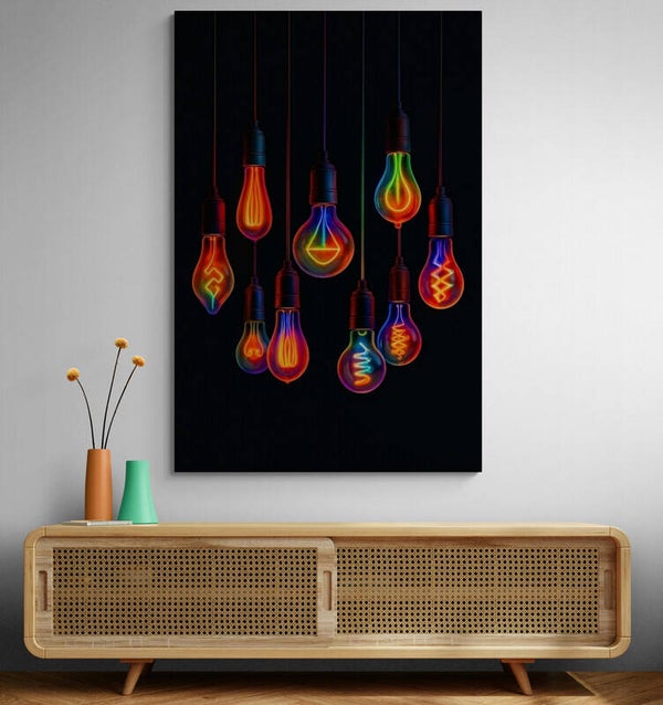 Een hypnotiserend kunstwerk dat futuristische gloeilampen toont in neonkleuren. Elke lamp gloeit in een unieke regenboogvorm, alsof ze een geheime energiebron verlichten. De diepe zwarte achtergrond versterkt het lichtspektakel en maakt dit werk ideaal voor creatieve ruimtes, moderne kantoren of stijlvolle woonkamers.