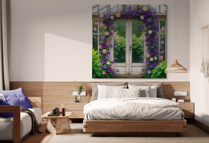 Een dromerige, romantische scène waarin een verweerde glazen tuindeur is omkranst met levendige paarse clematissen en zachtroze rozen. De natuurlijke symmetrie en het doorkijkje naar de groene tuin zorgen voor een betoverend effect, alsof je op het punt staat een geheim bloementerras binnen te stappen. Ideaal voor een rustgevend interieur met een vleugje Engelse charme of een botanische sfeer.