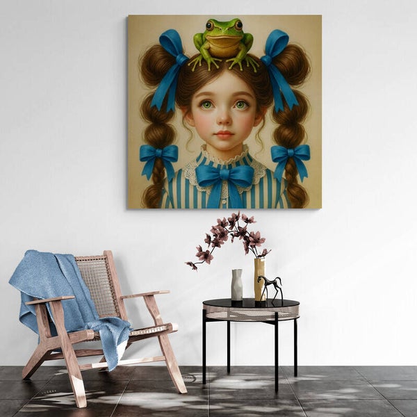 Een meisje met groene ogen en een kikker op haar hoofd, vastgelegd in een magisch-realistisch portret vol humor en verfijning. De heldere blauwe linten en strepen contrasteren prachtig met het zachte ivoor en geven het werk een frisse, vintage uitstraling. De subtiele penseelstructuur maakt het gezicht bijna tastbaar. Ideaal voor een gedurfde kinderkamer, een opvallende hal of als stijlvol accent in een eclectisch interieur.