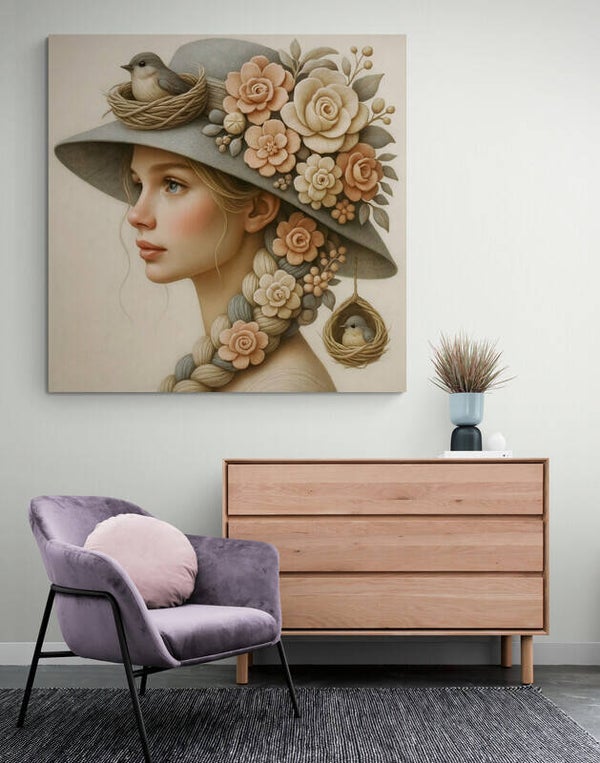 Een meisje in profiel met vlecht en hoed, versierd met bloemen en een vogelnestje. De subtiele penseelstructuur maakt dit portret schilderachtig en verfijnd. De zachte pasteltinten van zalmroze, beige en grijsblauw geven het werk een dromerige, natuurlijke uitstraling. Perfect als wanddecoratie voor een rustgevende slaapkamer, een romantische woonkamer of een sfeervol landelijk interieur.