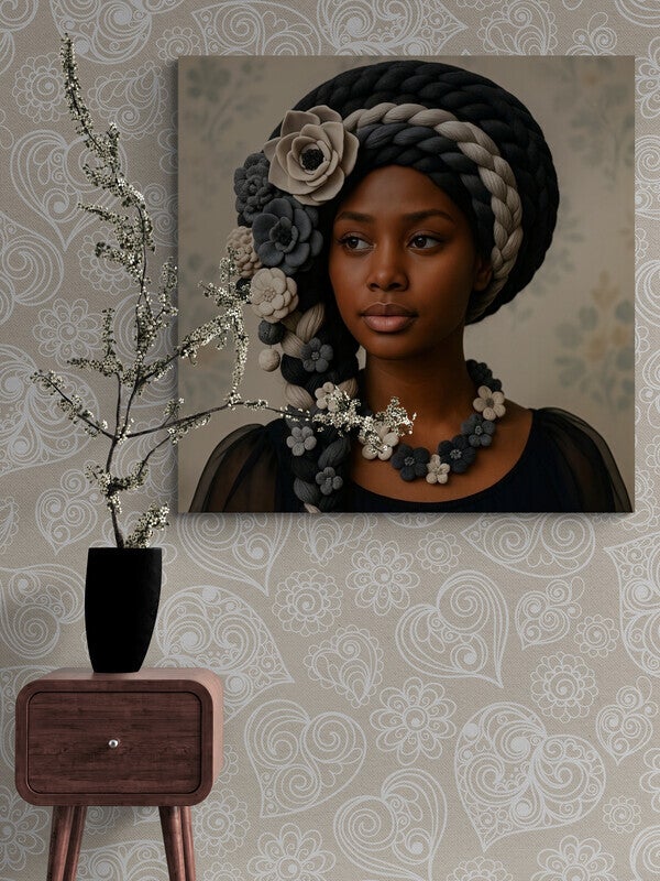 Een vrouw met een rijk gevlochten kapsel, versierd met bloemen in grijs en zilverachtige tinten. De subtiele penseelstructuur in haar gezicht en de zachte texturen geven dit portret een elegante en tijdloze uitstraling. De combinatie van zwart, antraciet en crème maakt dit kunstwerk ideaal voor interieurs in modern-klassieke, Japandi en minimalistische stijl. Een verfijnde wanddecoratie die rust en klasse uitstraalt.