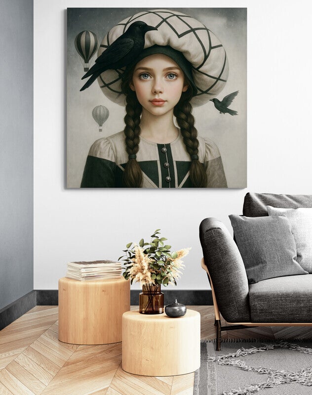 Een surrealistisch kunstwerk waarin een meisje met vlechtjes en een kraai op haar hoed de hemel in kijkt. Achter haar zweven luchtballonnen en kraaien, wat een mysterieuze en dromerige sfeer oproept. Een uniek schilderij dat perfect past in een modern interieur met een vleugje fantasie.