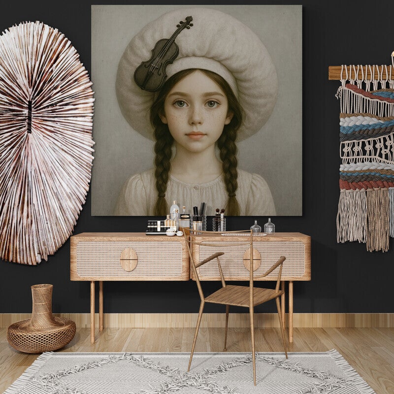 Een dromerig schilderij van een meisje met zachte blik en een viool als kroon op haar hoed. Het werk ademt stilte en muziek tegelijk – alsof de melodie alleen in gedachten klinkt. Subtiele aardetinten en ingetogen details maken dit kunstwerk geschikt voor een bohemian, klassiek of Scandinavisch interieur.