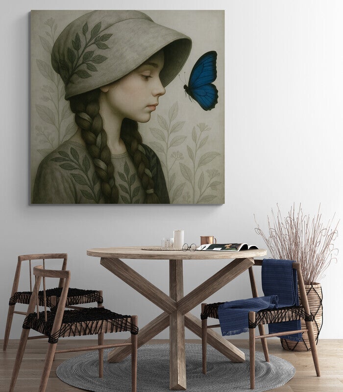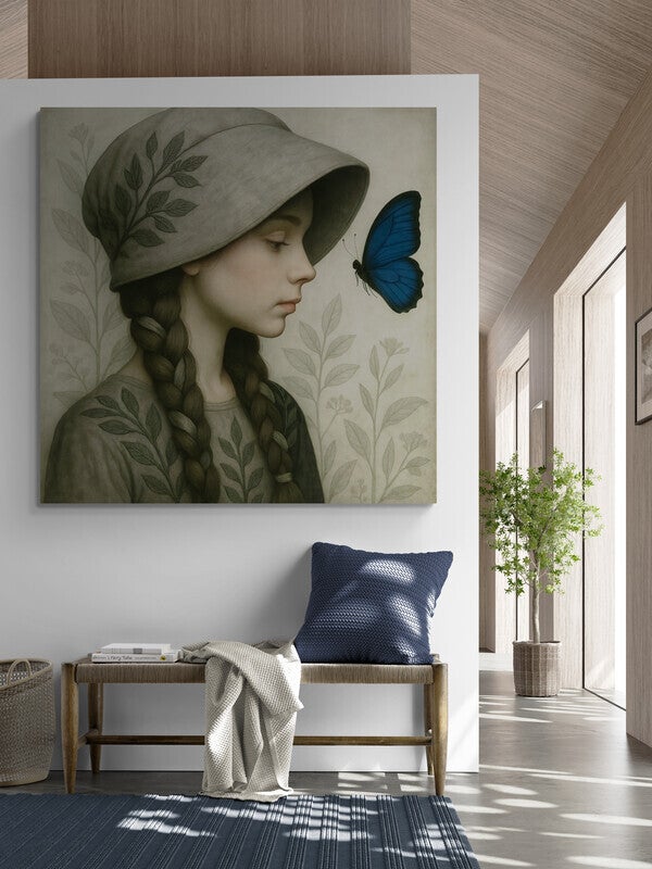 Een dromerig schilderij van een meisje met vlechten, omringd door zachte bladeren en een stralend blauwe vlinder. Het moment lijkt stilgezet in de tijd, alsof de vlinder een geheim fluistert dat alleen zij kan horen. Dit kunstwerk ademt natuur, stilte en verwondering en past perfect in een landelijk, bohemian of Scandinavisch interieur.