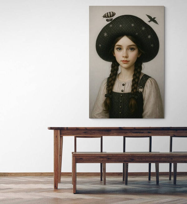 Een sprookjesachtig schilderij van een meisje met donkere vlechten en een grote zwarte hoed, bezaaid met fonkelende sterren. Boven haar zweeft een luchtballon, terwijl een vogel in vrije vlucht de stilte doorbreekt. Dit kunstwerk roept de sfeer op van avontuur, mysterie en stille dromen. Perfect voor een interieur dat verlangt naar poëzie, verbeelding en een vleugje magie.