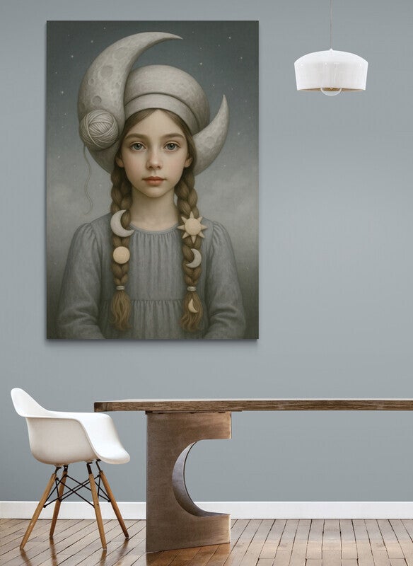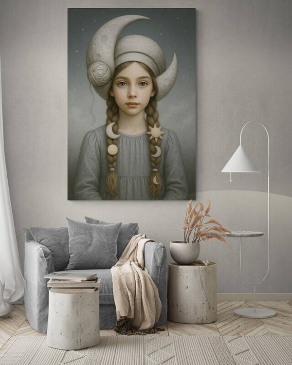 Een sprookjesachtig schilderij van een meisje met vlechten, versierd met manen en sterren. Op haar hoed rust een maanvormige kroon met een magische bol. Dit kunstwerk straalt mysterie, stilte en dromerige schoonheid uit. Het past moeiteloos in bohemian, romantische, Scandinavische en zelfs minimalistische interieurs.