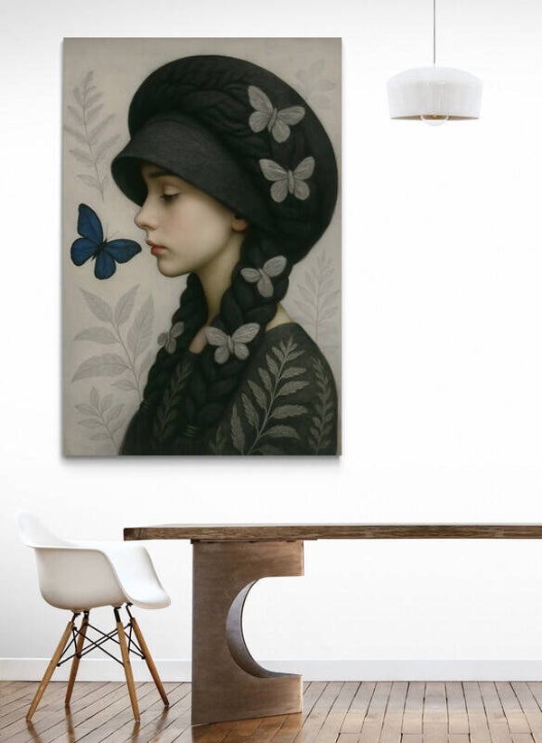 Een sprookjesachtig schilderij van een meisje in profiel, met donkere vlechten versierd met zachte zilveren vlinders. Voor haar zweeft een helderblauwe vlinder, alsof ze een geheim deelt tussen stilte en beweging. Dit kunstwerk ademt mystiek, poëzie en rust, perfect voor interieurs met een bohemian, romantische, Japandi of Scandinavische stijl.
