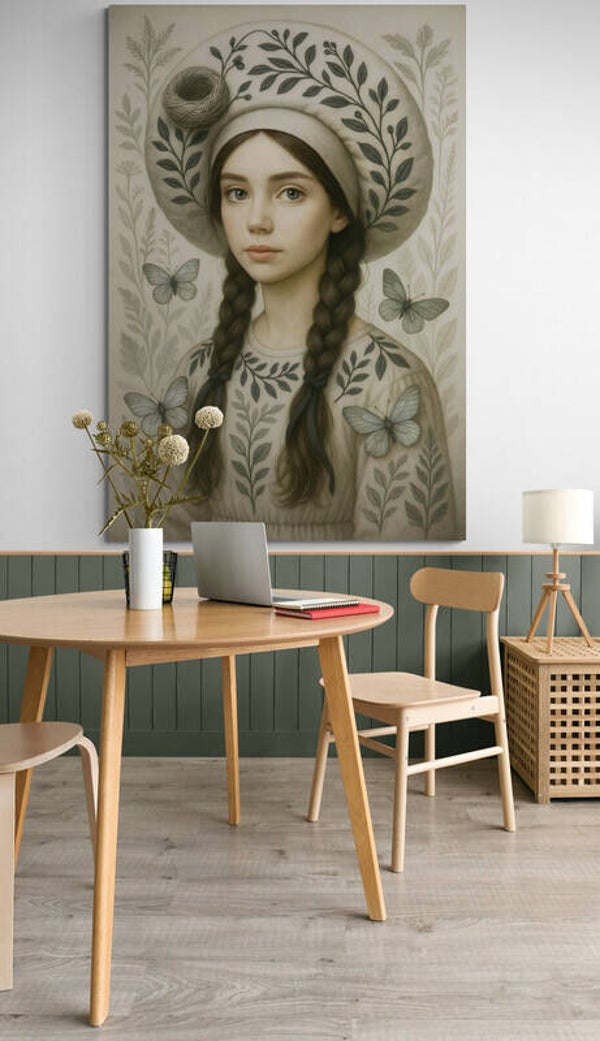 Een mystiek schilderij van een meisje met donkere vlechten, omringd door vlinders en bladeren die in zachte grijstinten en groenblauwe nuances zijn weergegeven. Het werk straalt rust, natuur en sprookjesachtige poëzie uit, ideaal voor interieurs met een bohemian, Japandi, Scandinavische of romantische stijl.