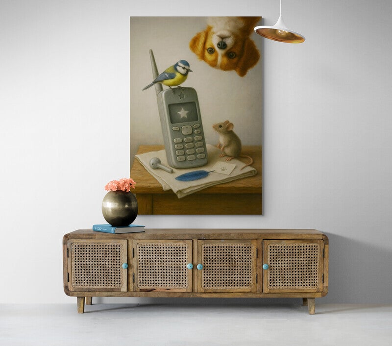 Een warm en nostalgisch schilderij waarin een hond nieuwsgierig meekijkt terwijl een muis en een vogel een klassieke telefoon onderzoeken. Dit kunstwerk brengt een vleugje humor en poëzie in elk interieur, van landelijk en nostalgisch tot bohemian en modern klassiek.