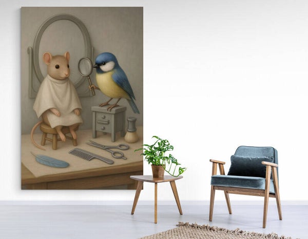 Een sfeervol schilderij waarin een muis geduldig in de kappersstoel zit, terwijl een koolmees met vergrootglas de laatste details inspecteert. Op tafel liggen een kam, schaar en scheerkwast, waardoor de scène een charmante knipoog geeft naar ouderwetse kapsalons.