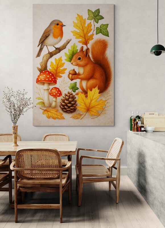 Een sfeervol schilderij waarin een roodborstje en een eekhoorn samen in een herfstlandschap verschijnen. Omringd door bladeren, paddenstoelen en een dennenappel vormt dit tafereel een warme en gezellige decoratie. Een perfect kunstwerk voor wie houdt van bos, natuur en landelijke woonstijlen.