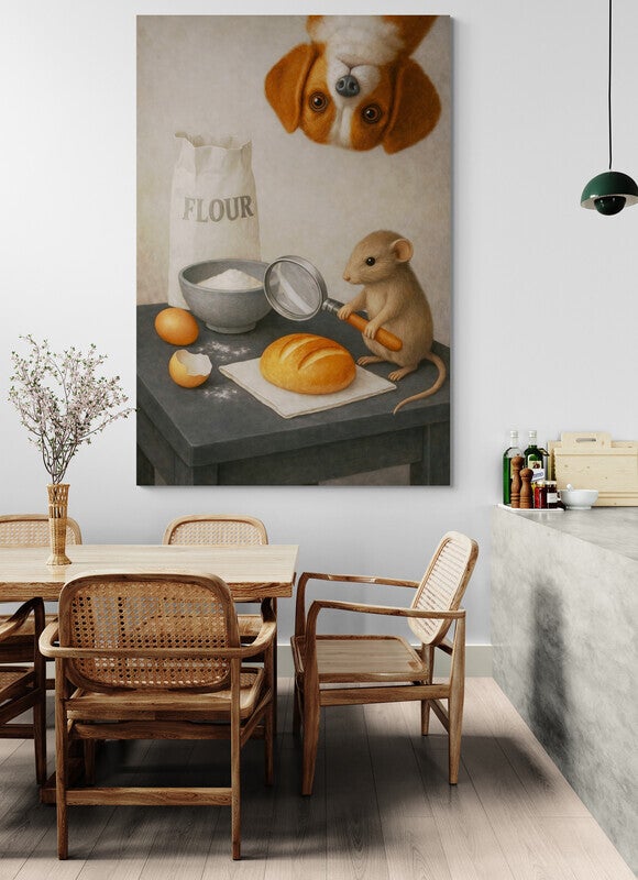 Een sfeervol schilderij waarin een muis en een hond samen een bakmoment beleven. Op tafel staan brood, meel en eieren, weergegeven in zachte landelijke stijl. Dit kunstwerk past perfect in een landelijke keuken of woonkamer, maar is ook geschikt als wanddecoratie voor bakkers, lunchrooms of sfeervolle winkels.