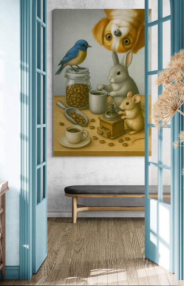 Een sfeervol schilderij waarin een konijn, een muis en een vogel samen rond de koffietafel zitten. Een glazen pot vol koffiebonen, een klassieke koffiemolen en dampende kopjes brengen een nostalgische cafésfeer tot leven. Het speelse hondje kijkt nieuwsgierig van bovenaf toe. Dit kunstwerk past perfect in landelijke keukens, cafés, koffiecorners of woonkamers waar warmte en gezelligheid centraal staan.