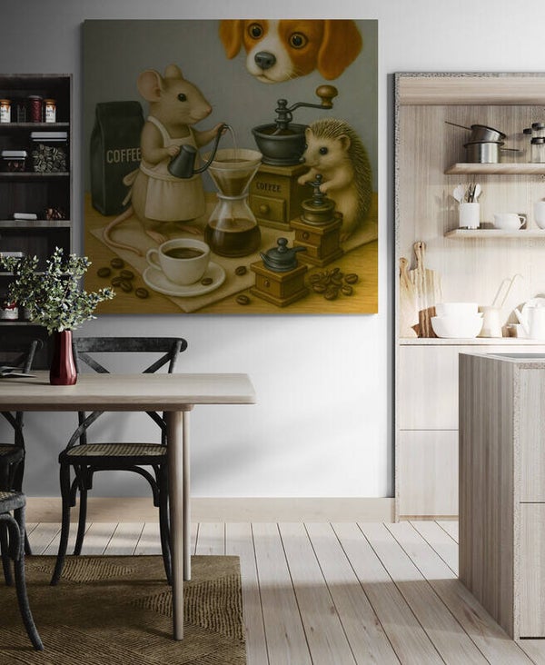 Een sfeervol tafereel waarin een muis en een egel samen koffie zetten. Terwijl de muis zorgvuldig het hete water in de pot giet, maalt de egel de bonen in een klassieke koffiemolen. De hond kijkt nieuwsgierig toe, alsof hij wacht op het eerste kopje. Een warme en nostalgische compositie die perfect past in landelijke en gezellige interieurs.