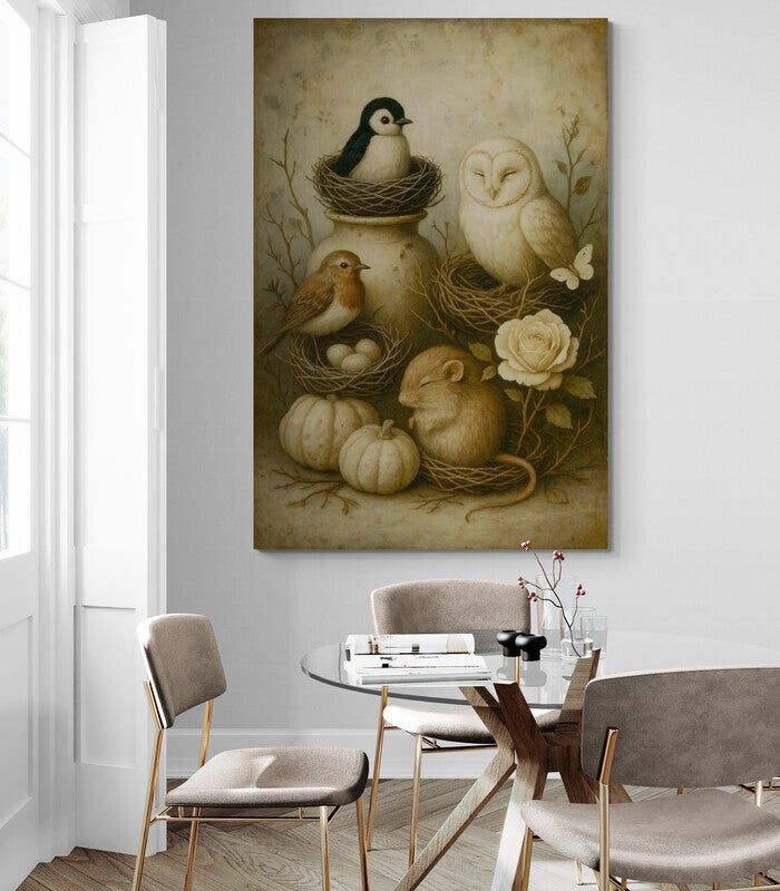 Een nostalgisch kunstwerk in schilderstijl dat een gevoel van rust en geborgenheid uitstraalt. In deze compositie zien we een uil die vredig de ogen sluit, een roodborst op een nestje met eieren, een muis die zacht in slaap lijkt te vallen en een zwart-wit vogeltje hoog in een ander nest. Tussen de nesten staan pompoenen en een witte roos, met daarnaast een sierlijke vlinder. De warme tinten en de subtiele verweerde achtergrond geven het geheel een klassieke, oude uitstraling, alsof het een erfstuk is dat al generaties meegaat. Perfect voor liefhebbers van vintage kunst en landelijke woonstijlen.