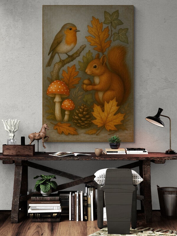 Een warm en sfeervol schilderij in landelijke stijl waarin een nieuwsgierige eekhoorn met een eikel in zijn pootjes centraal staat. Naast hem zit een roodborstje op een tak, omringd door paddenstoelen, dennenappels en kleurrijke herfstbladeren. De oude rand en klassieke afwerking geven dit kunstwerk een nostalgische uitstraling die prachtig past in een landelijk interieur. Een tijdloos stilleven dat de schoonheid van de herfst naar binnen haalt.