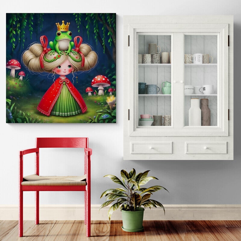 Een magisch schilderij van een prinses in het bos, gekleed in een rode mantel en groene jurk. Op haar kapsel met rode linten zit een kikker met een gouden kroon, wat dit kunstwerk een sprookjesachtige en koninklijke uitstraling geeft. De paddenstoelen en de nachtelijke bossetting maken het een betoverende wanddecoratie voor kinderkamers of woonkamers met een vleugje fantasy.