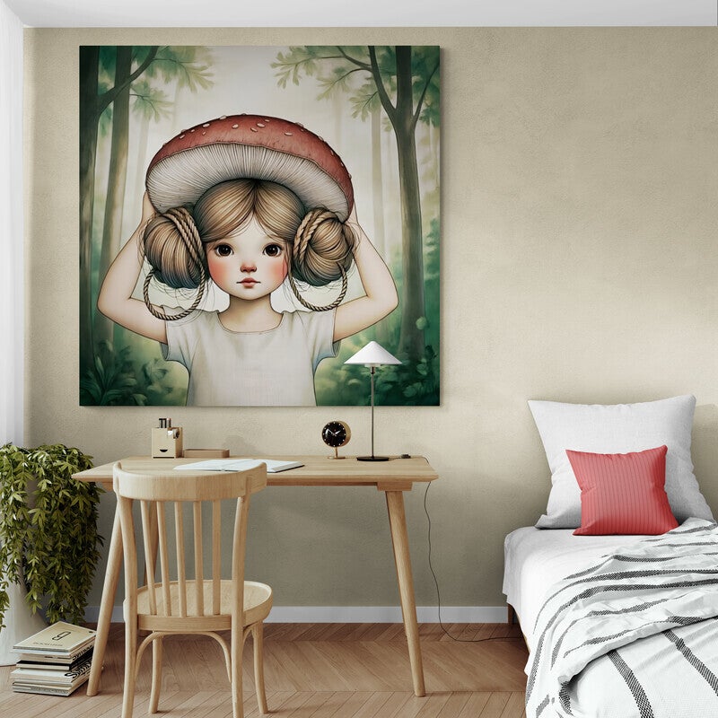 Een dromerig schilderij van een meisje dat een grote paddenstoel boven haar hoofd draagt. De zachte beige tinten in haar kleding en kapsel combineren prachtig met het groene bos op de achtergrond. Dit kunstwerk ademt een sprookjesachtige en serene sfeer en is een unieke keuze als wanddecoratie voor kinderkamers, speelhoeken of een interieur met een vleugje fantasy.