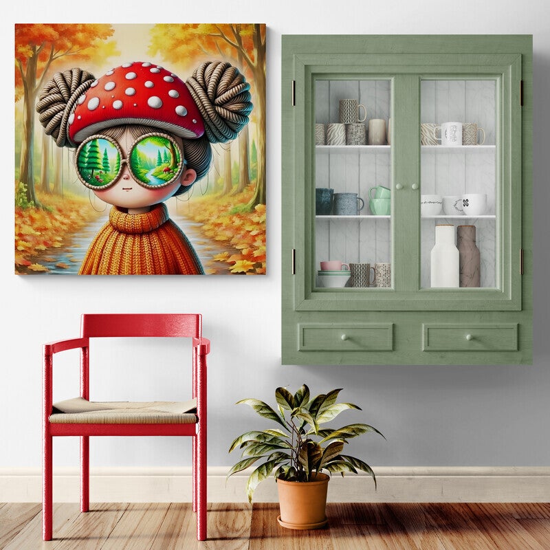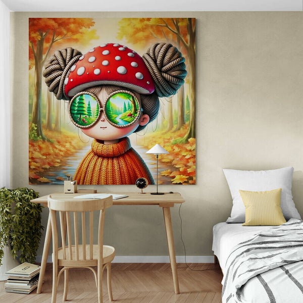 Een magisch schilderij van een meisje met een rode paddenstoelenmuts en grote ronde bril waarin een sprookjesachtig boslandschap wordt weerspiegeld. De warme herfstkleuren en het speelse karakter maken dit kunstwerk een echte eyecatcher. Perfect als wanddecoratie in een kinderkamer, woonkamer of een interieur dat baat heeft bij een vleugje fantasy en warmte.