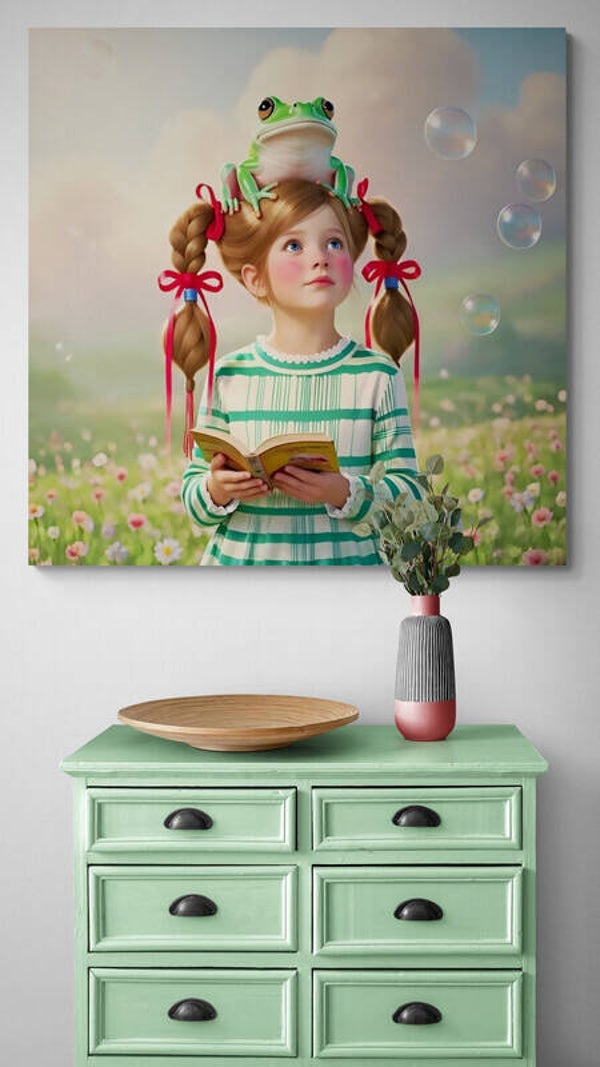 Een dromerig schilderij van een meisje met vlechten en rode strikken, dat een boek leest terwijl een groene kikker op haar hoofd zit. Ze staat in een veld vol bloemen met zachte pastelkleuren en zwevende bellen, wat een betoverende en sprookjesachtige sfeer creëert. Dit kunstwerk is een prachtige keuze als wanddecoratie voor een kinderkamer of een interieur dat een vleugje fantasy en poëzie wil toevoegen.