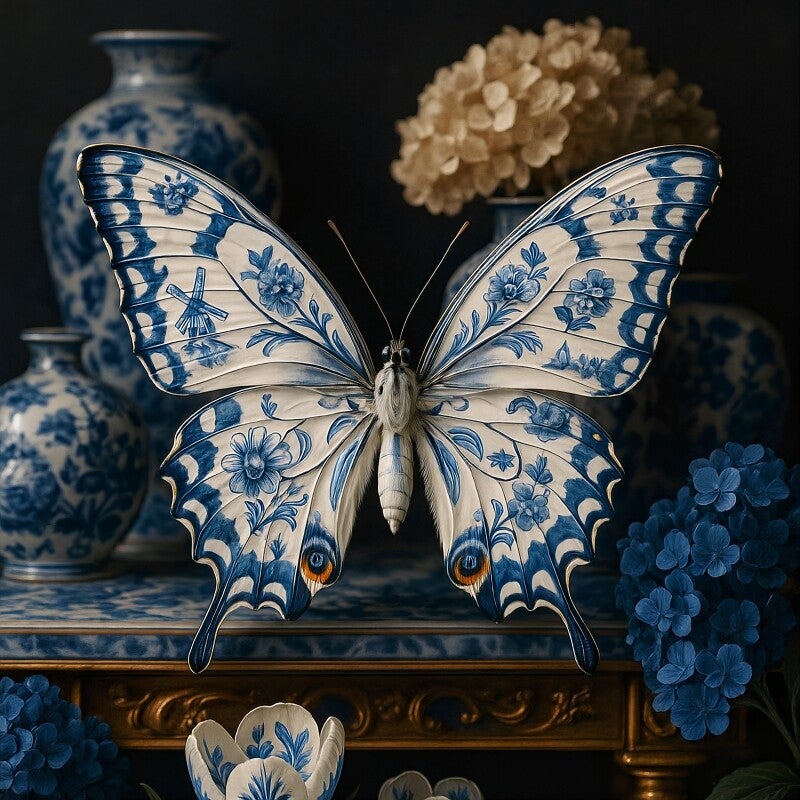 Vlinder met Delfts blauw porseleinmotief op de vleugels