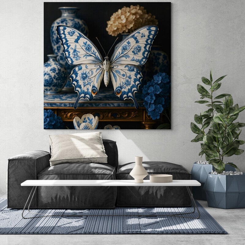 Delfts blauw vlinder schilderij – kunstzinnige vlinder met porselein motieven