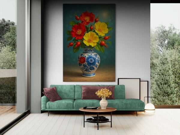 Een opvallend schilderij waarin felrode en zonnig gele bloemen schitteren boven een traditioneel Delfts blauwe vaas. De combinatie van frisse kleuren met de tijdloze porselein-stijl zorgt voor een harmonieus kunstwerk dat warmte en elegantie uitstraalt. Het speelse detail van de rozenbottels maakt het geheel extra levendig. Perfect om een muur tot leven te brengen in woonkamer, keuken of eetkamer.