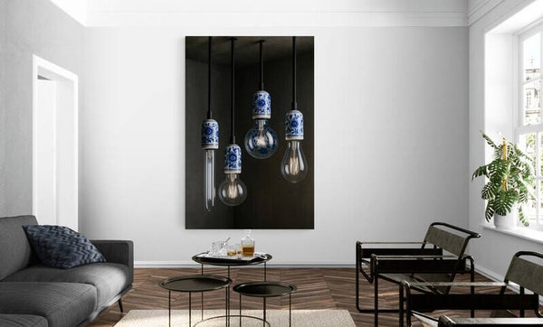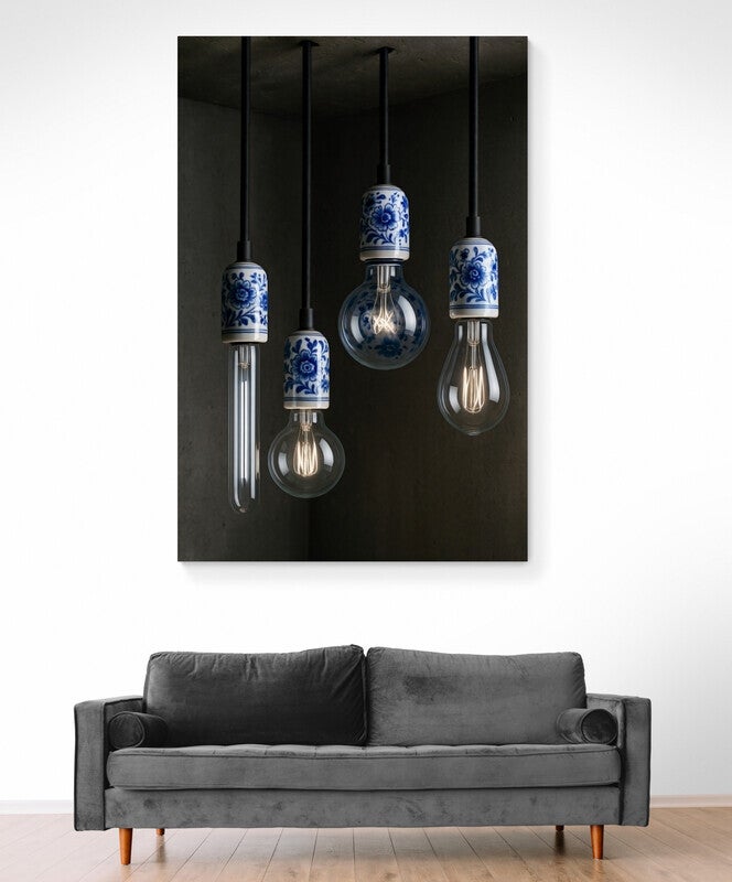 Een unieke set moderne hanglampen waarin klassiek Delfts blauw keramiek gecombineerd wordt met strakke Edison-lampen. De handgeschilderde patronen geven de lampen een tijdloze, Hollandse charme, terwijl de minimalistische vormgeving zorgt voor een eigentijdse uitstraling. Ideaal als blikvanger boven de eettafel, in de keuken of als stijlvol detail in een modern interieur.