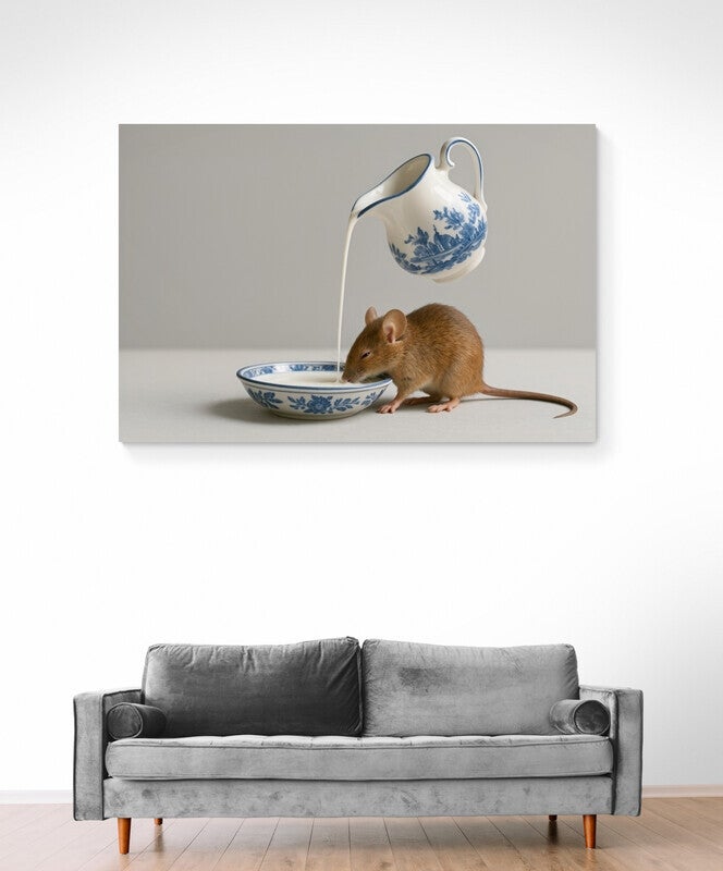 Een speels en uniek kunstwerk: een nieuwsgierig muisje drinkt melk uit een Delfts blauw schaaltje, terwijl een klassiek blauw-wit melkkannetje de melk giet. Dit schilderij combineert humor en verfijning, en voegt een vleugje Nederlandse folklore en gezelligheid toe aan ieder interieur. Perfect als wanddecoratie voor liefhebbers van verrassende kunst met een knipoog.