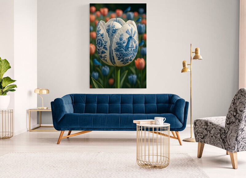 Delfts blauwe tulp met molen – Hollands erfgoed als kunstwerk