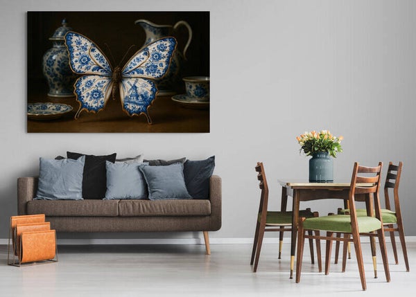 Een betoverend kunstwerk waarin een sierlijke vlinder centraal staat, met vleugels die versierd zijn in Delfts blauw bloemmotief en een Hollandse windmolen. De combinatie van natuur en traditie maakt dit schilderij uniek en krachtig. De warme bruine vlindertonen contrasteren prachtig met het frisse blauw-wit van het porselein, waardoor dit werk een gevoel van elegantie en verfijning uitstraalt. Een echte blikvanger voor elk interieur.